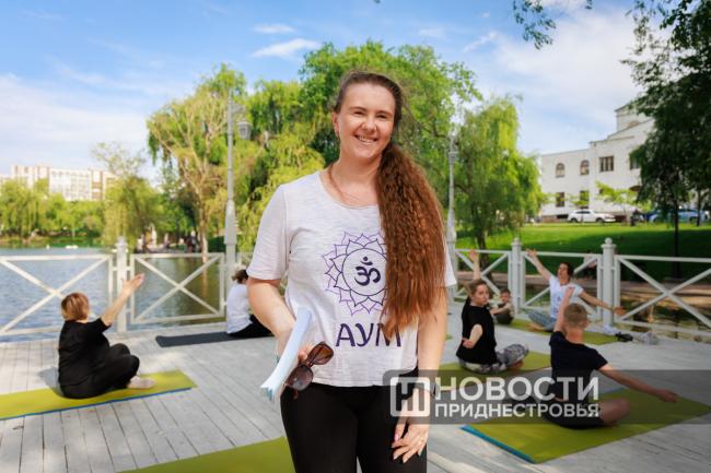 В одном из живописных уголков Екатерининского парка - на пирсе – занятия по йоге и йоготерапии проводили представители центра «Аум». Это самый большой центр йоги в Приднестровье. Он находится в центре столицы. Там проводятся занятия по хатха-йоге, флай-йоге, нейрофитнес для малышей и другие программы. Сегодня для любителей спокойных видов спорта проводилась хатха-йога.