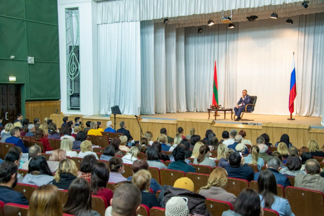 Тирасполь, 21 апреля. /Новости Приднестровья/. Глава государства Вадим Красносельский провёл встречу с преподавателями и студентами Приднестровского госуниверситета. Студенты и преподаватели спрашивали о перспективах дальнейших инфраструктурных преобразований, начатых и активно реализуемых по инициативе Президента.