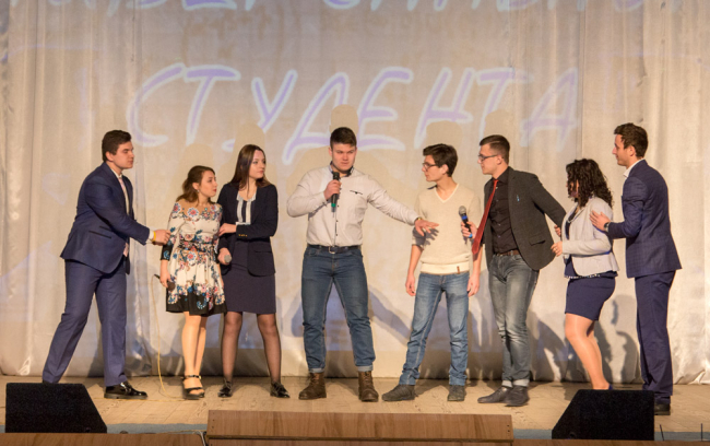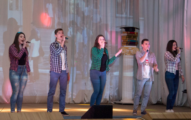 После поздравлений началась концертная программа. На сцене выступили студентки экономического факультета, продемонстрировавшие дефиле, затем их сменила команда КВН «Гагарин».