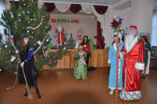 Как сообщается на сайте районной госадминистрации, в актовом зале первой городской школы состоялось яркое театрализованное представление с участием традиционных сказочных персонажей (Бабы Яги, Кикиморы, Лешего) и современного стилиста, который помог лесной нечисти стать красивее. Ребята с удовольствием водили вместе с Дедом Морозом и Снегурочкой хороводы вокруг ёлки, принимали участие в играх и отгадывали загадки.