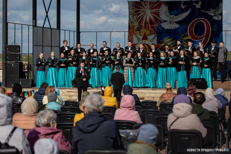 Открыл программу Государственный симфонический оркестр. Помимо классических композиций, музыканты вместе с вокалистами исполнили известные военные песни «Если б не было войны», «А зори здесь тихие», «Журавли», «Тёмная ночь» и другие. Перед бендерчанами выступил и Приднестровский государственный хор.