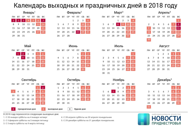 Тирасполь, 19 декабря. /Новости Приднестровья/. Новогодние, февральские и мартовские длинные выходные ожидают жителей Приднестровья в 2018 году.