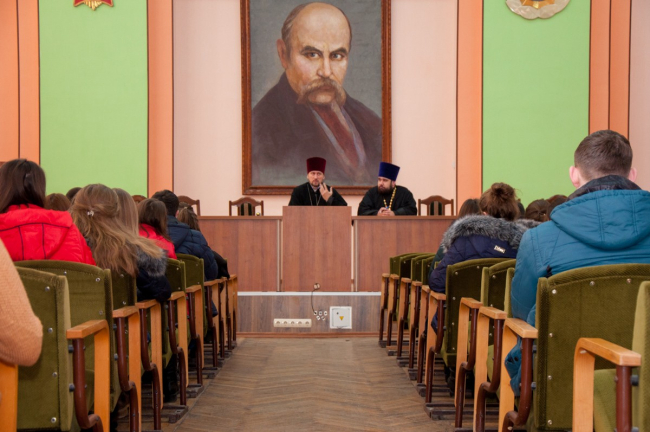 После молебна состоялась встреча студентов со священнослужителями в актовом зале госуниверситета