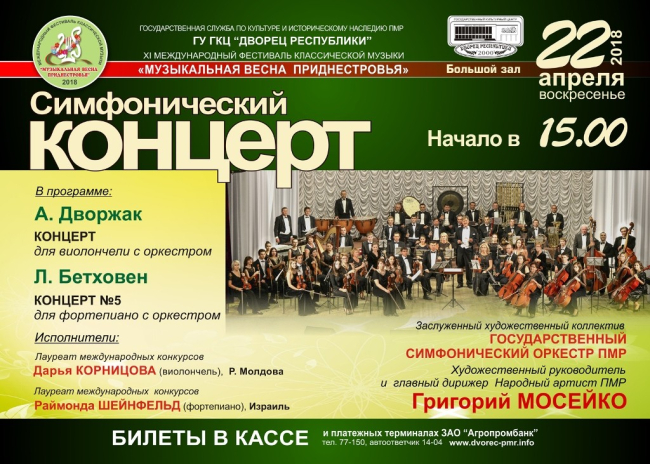 Как сообщил нашему корреспонденту музыковед Государственного симфонического оркестра, Заслуженный деятель искусств ПМР Ольга Мосейко, впервые в республике будут сыграны такие известные во всем мире произведения, как «Концерт для виолончели с оркестром» А. Дворжака и «Концерт №5 для фортепиано с оркестром» Л. Бетховена.