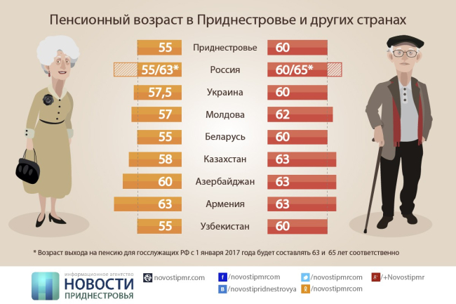 В ПМР мужчины выходят на пенсию по достижении 60 лет, а женщины – по достижении 55 лет. Такая же планка пенсионного возраста установлена в Белоруссии и Узбекистане. В России пенсионный возраст для основной массы граждан также составляет 55 и 60 лет, однако для чиновников выход на пенсию по выслуге лет с 1 января 2017 года станет возможен только по достижении женщинами-госслужащими возраста 63-х лет, а мужчинами – 65 лет.