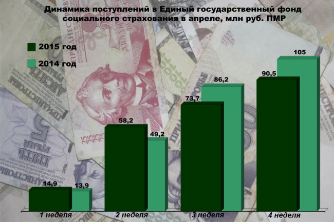 В доход бюджета Единого государственного фонда социального страхования в апреле этого года поступило 90 953 058 руб. ПМР. В апреле 2014-го эта сумма составляла 105 016 303 рублей ПМР.