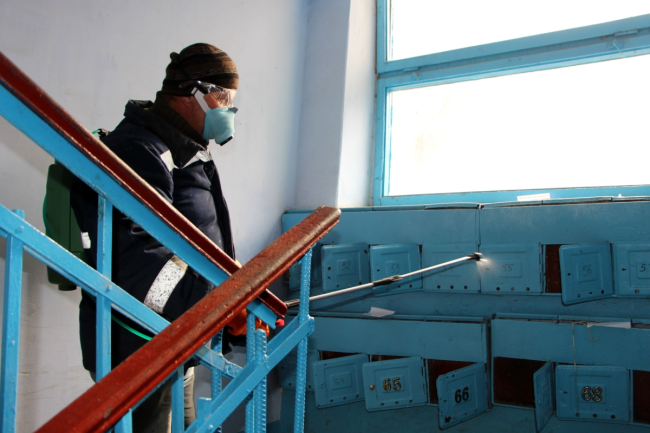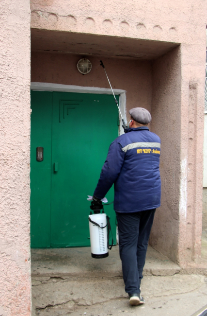 «Специальным дезинфицирующим раствором мы обрабатываем поручни, перила лестничных маршей, входы в подъезды, дверные ручки, почтовые ящики, лифты. За день планируем обойти весь город, работает не одна группа», – рассказал рабочий комплексного обслуживания зданий МУП «ЖЭУК г. Рыбница» Владимир Гратило.