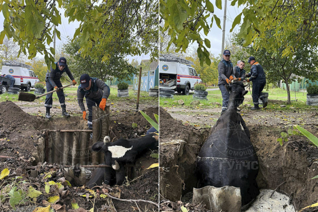 На помощь прибыли спасатели ГУпЧС. Чтобы достать до бурёнки, они разобрали металлический каркас и частично подкопали землю. С помощью цепи и лебёдки корову аккуратно подняли на поверхность.