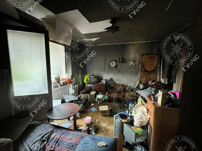 Огнём уничтожены одна комната, где был очаг возгорания, и личные вещи. Закопчены стены соседнего помещения.
