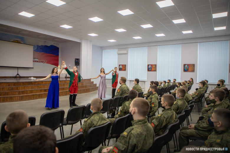 Затем в актовом зале состоялось театрализованное выступление суворовцев. Передать атмосферу эпохи, в которой жил Александр Суворов, помогли костюмы. Началось выступление с бала. Также юные суворовцы исполнили песню, посвященную великому генералиссимусу и подвигам его солдат.