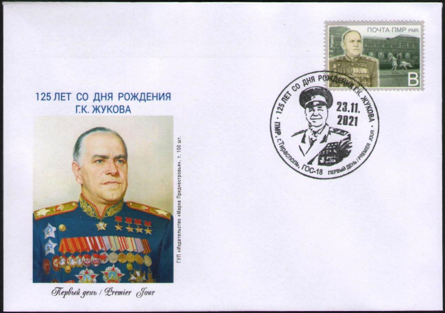 Другой почтовый выпуск издан к 125-летию Георгия Жукова, маршала Советского Союза, четырежды героя Советского Союза, дважды кавалера ордена Победа, шесть орденов Ленина. Маршал Победы, принимающий парад Победы 1945 года. Тираж марки – 5600 штук (700 малых листов).