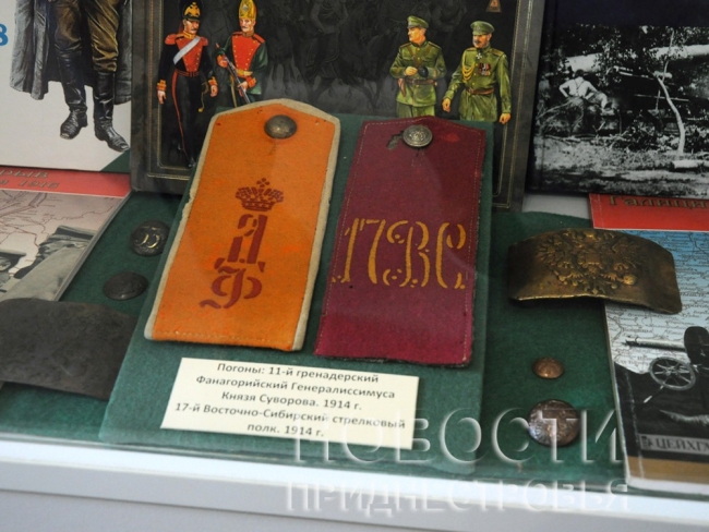 В Тираспольском объединённом музее сегодня состоялось открытие выставки «Старт глобальных потрясений», которая будет экспонироваться до конца сентября. Здесь представлены экспонаты как из фондов музея, так и из частных коллекций. Это подлинные образцы оружия, военная атрибутика Первой мировой войны, печатные издания, марки, монеты, открытки, плакаты.