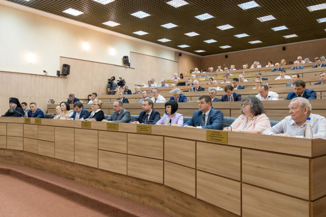 Вадим Красносельский обратился к Правительству и депутатам с трибуны зала пленарных заседаний Верховного Совета ПМР. Среди приглашённых – руководство и члены Правительства ПМР, парламентарии, руководящий состав государственных администраций городов и районов республики, различных ведомств и организаций, в том числе общественных, а также архиепископ Тираспольский и Дубоссарский Савва.