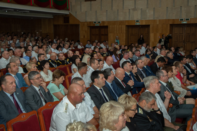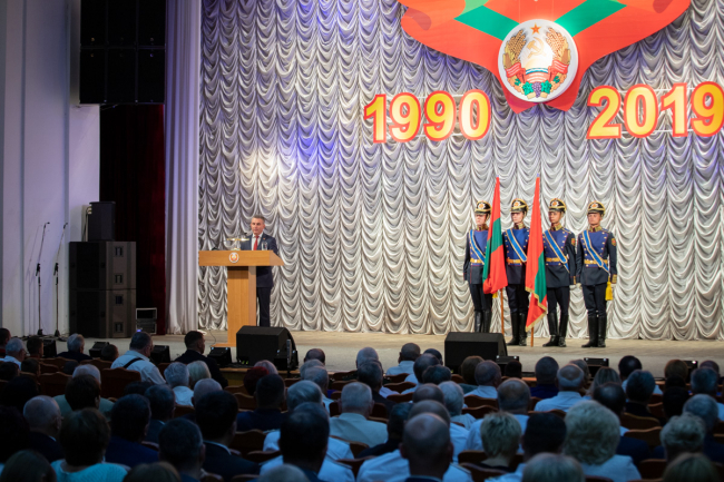 Тирасполь, 30 августа. /Новости Приднестровья/. Президент ПМР Вадим Красносельский выступил на торжественном собрании по случаю 29-й годовщины образования Приднестровской Молдавской Республики. Во Дворце Республики присутствовали глава Правительства ПМР Александр Мартынов, председатель Верховного Совета ПМР Александр Коршунов, глава Официального представительства Южной Осетии в ПМР Виталий Янковский, уполномоченный представитель Республики Абхазия в ПМР Александр Ватаман, руководители госучреждений, общественные деятели, представители молодёжи.