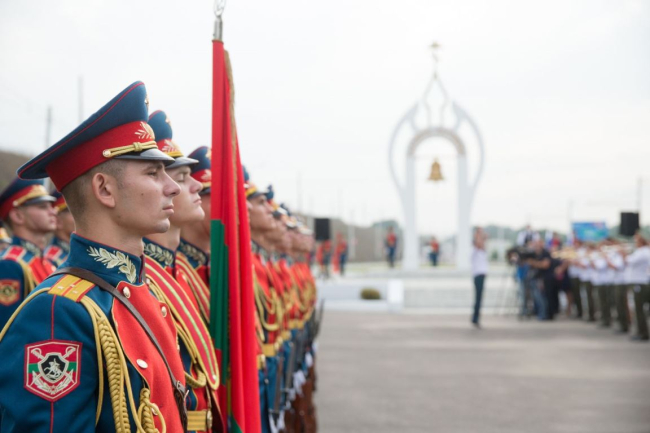 Под аркой, выполненной в виде крыльев ангела, подвешен колокол, символизирующий благую весть о мире. Сегодня в него ударили Президент Приднестровья и временный поверенный в делах России в Молдове.