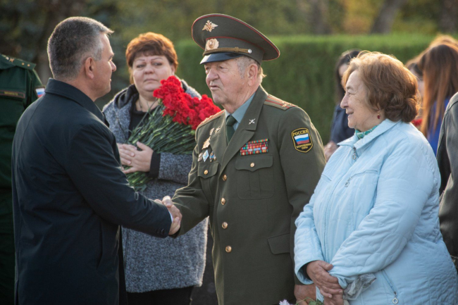 Венок, корзины и россыпь цветов оставили у Вечного огня, могильных плит и памятников мемориального комплекса. Живые цветы как символ благодарности потомков легли и к памятникам его основателям – императрице Екатерине Великой, генералиссимусу Суворову и архитектору-градостроителю Францу де Волану.