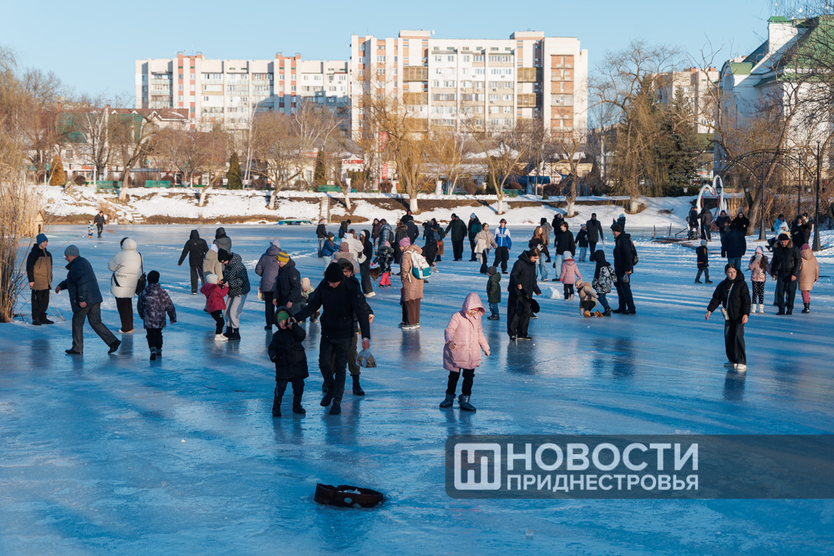 В парке было довольно шумно: дети вовсю играли в снежки и лепили снежную бабу. Это и неудивительно, ведь нынешняя зима выдалась для Приднестровья особенно морозной. Настолько, что десятки людей смогли сегодня покататься по льду замёрзшего озера.