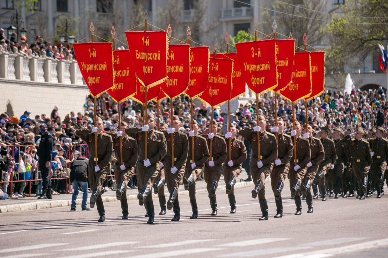 Вслед за бронетехникой Победы на площадь Суворова вынесли штандарты 13 фронтов Великой Отечественной войны. По традиции их несли курсанты и офицеры Военного института Министерства обороны в форме бойцов Красной армии 40-х годов прошлого века. Они наследники фронтовиков: их деды и прадеды воевали на полях сражений.