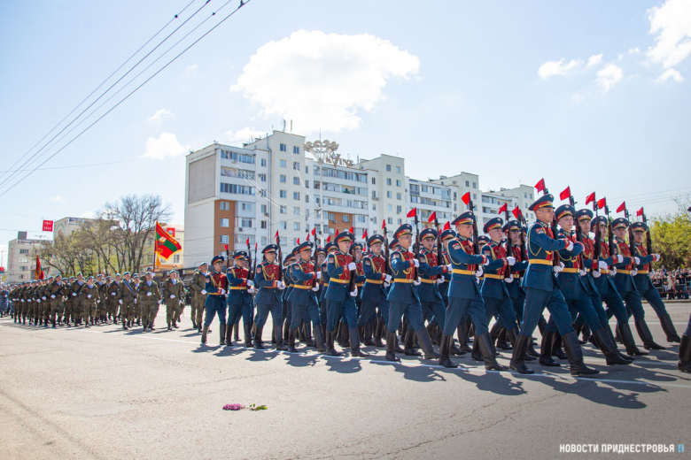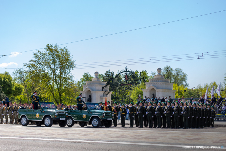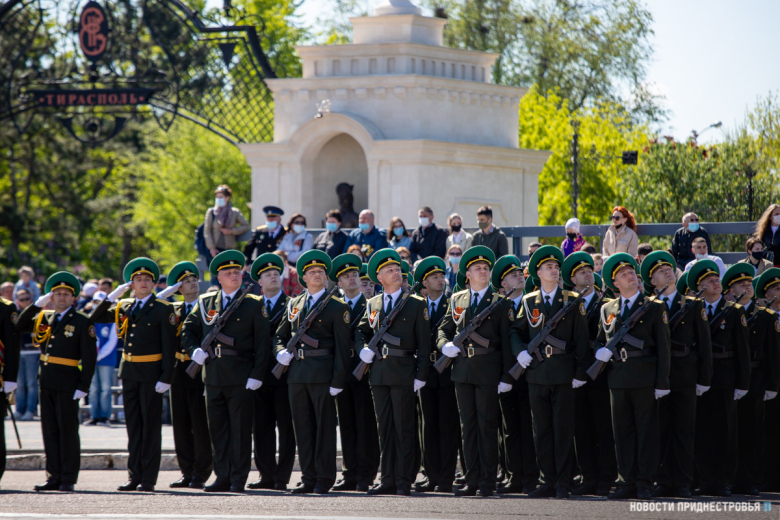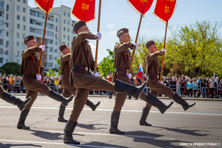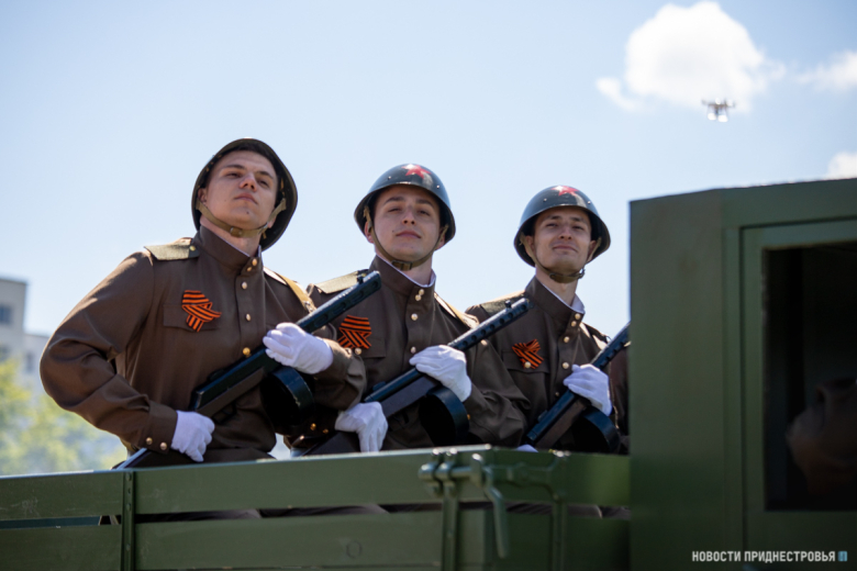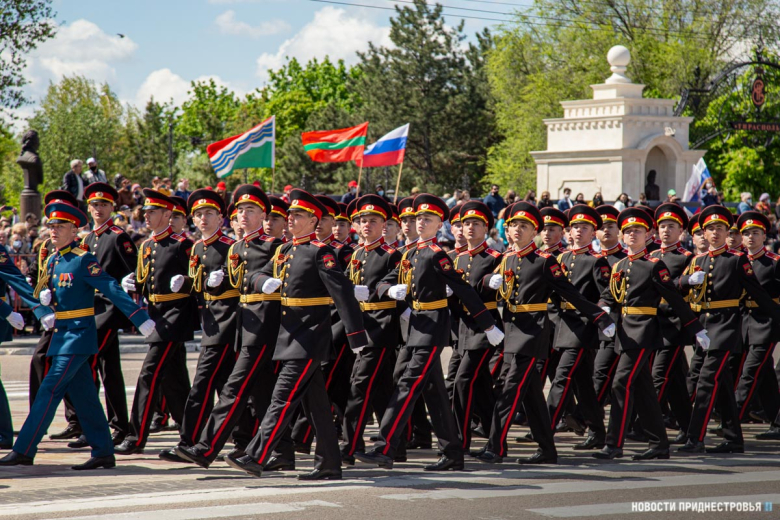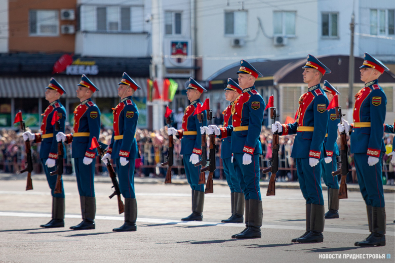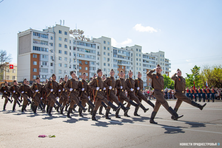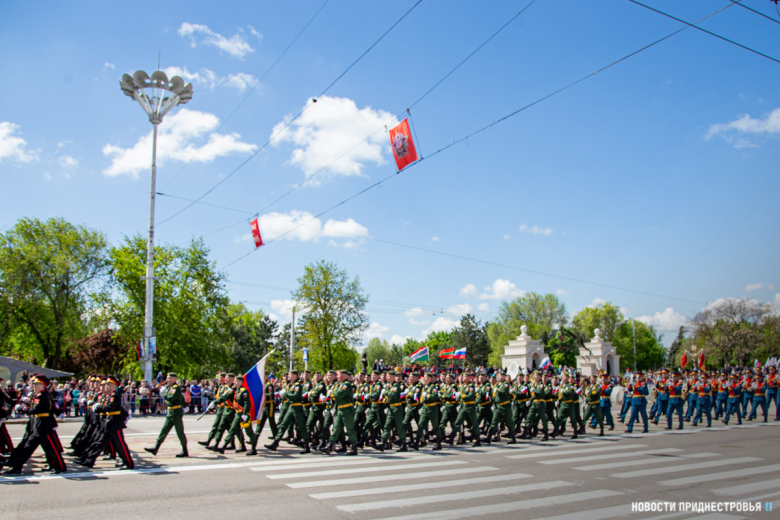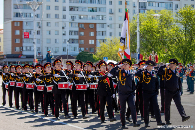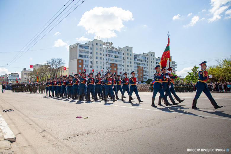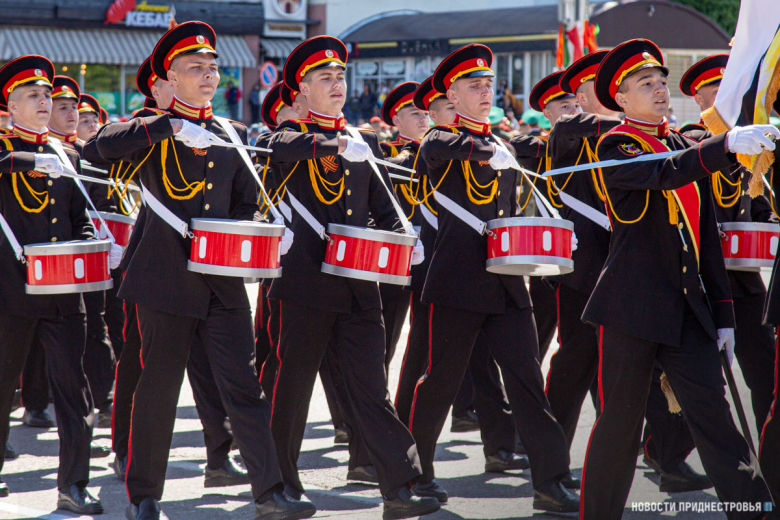 За ними строевым шагом прошли военнослужащие Вооружённых сил ПМР, Пограничного управления МГБ, МВД и подразделений Оперативной группы российских войск в Приднестровье, парадный расчет курсантов Военного института Министерства обороны в форме времен Великой Отечественной войны, а также будущие защитники Отечества – учащиеся Республиканского кадетского корпуса и Тираспольского Суворовского военного училища.