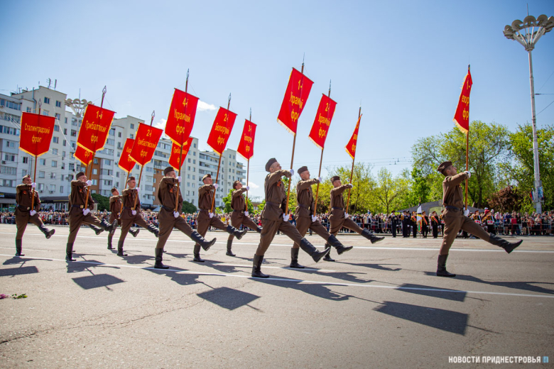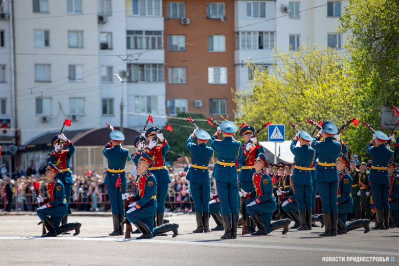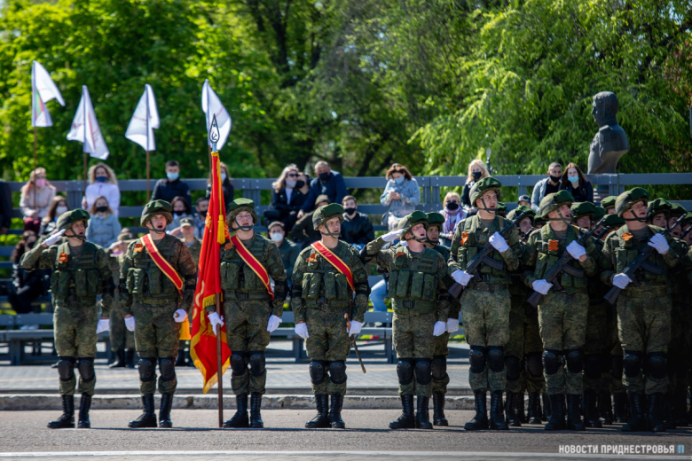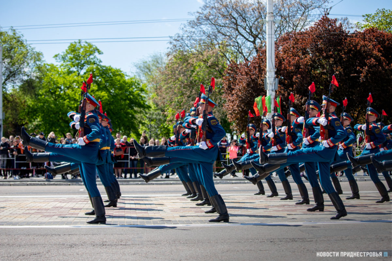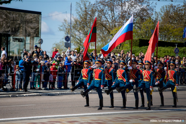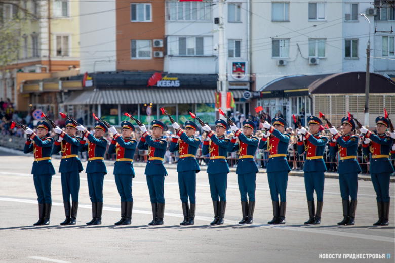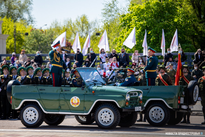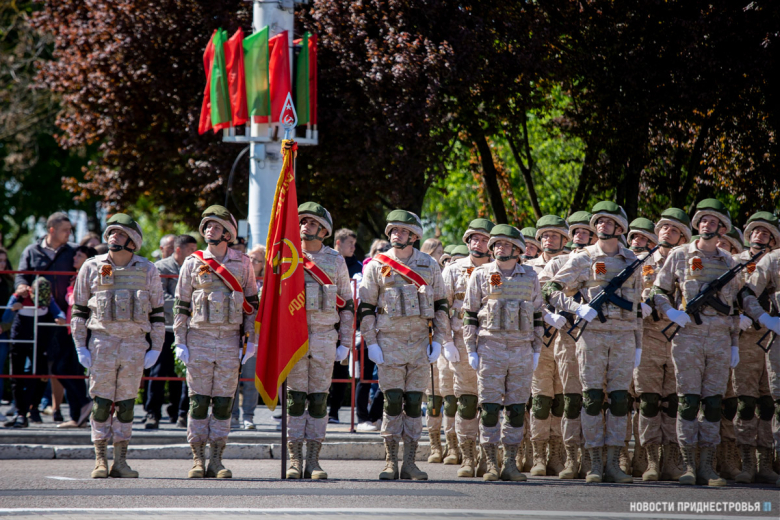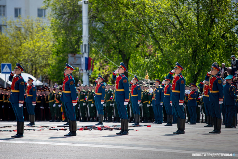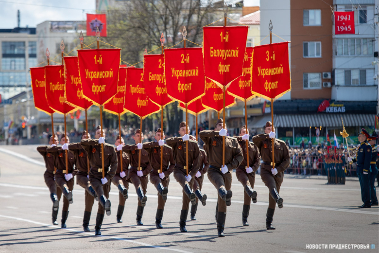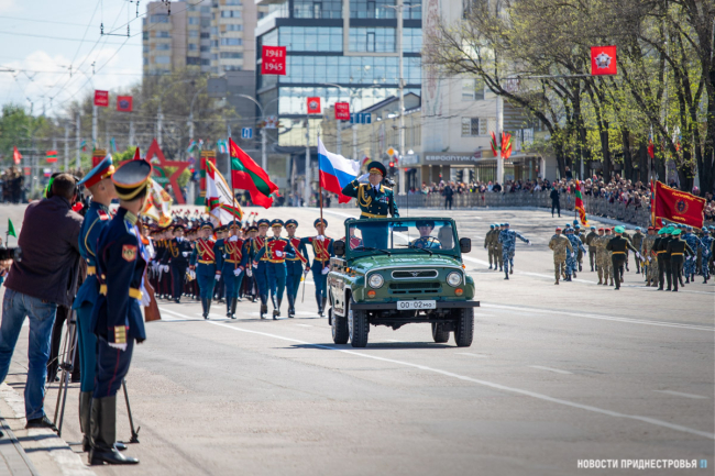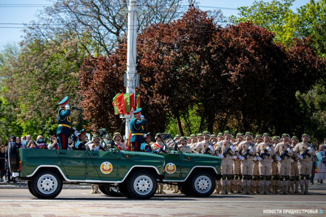 За ними строевым шагом прошли военнослужащие Вооружённых сил ПМР, Пограничного управления МГБ, МВД и подразделений Оперативной группы российских войск в Приднестровье, парадный расчет курсантов Военного института Министерства обороны в форме времен Великой Отечественной войны, а также будущие защитники Отечества – учащиеся Республиканского кадетского корпуса и Тираспольского Суворовского военного училища.