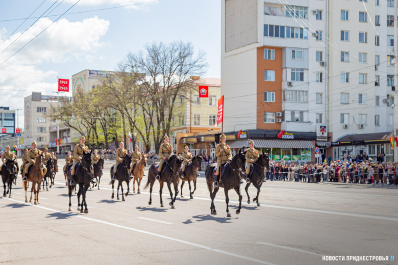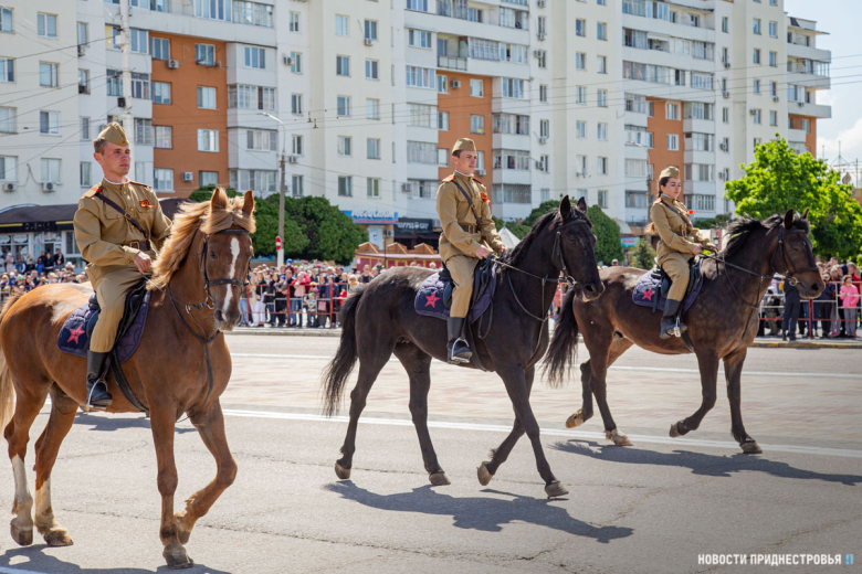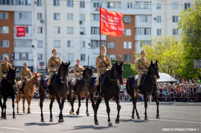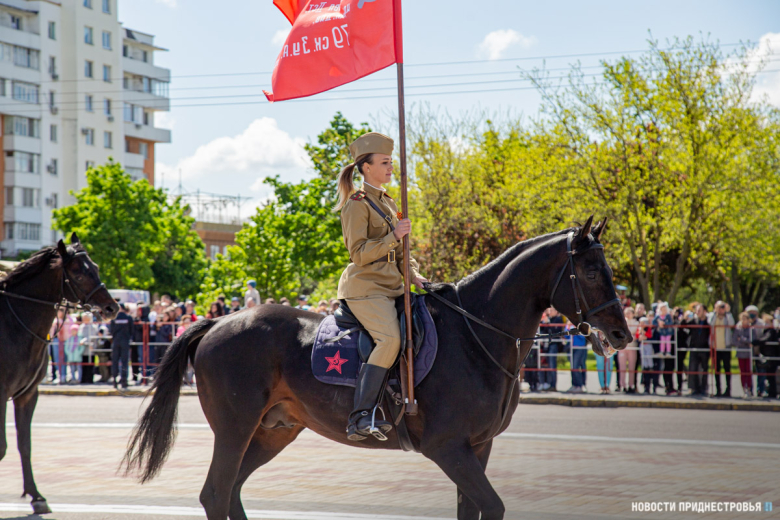 Под занавес Военного парада по площади Суворова прошёл конный расчёт МВД ПМР. Кавалеристы были одеты в форму времен Великой Отечественной войны. Конный расчет возглавила Елена Гудис, она несла точную копию Знамени Победы.