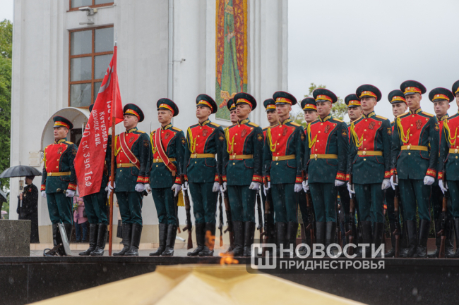 В руках у тираспольчанина Александра Артёменко необычные портреты. Они укрыты от дождя камуфляжной плащ-палаткой, а сзади реет Знамя Победы.