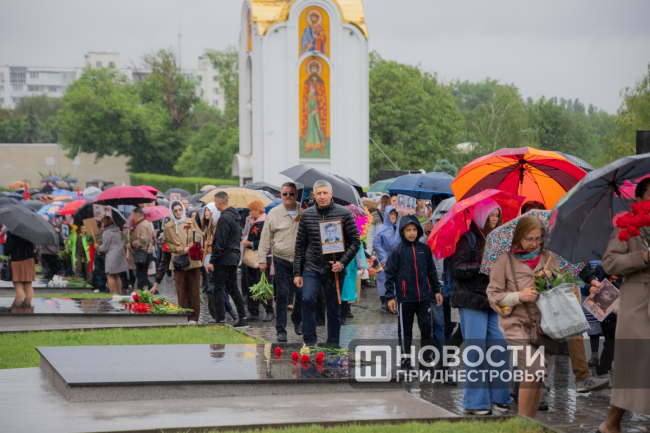 На протяжении всего дня на мемориал приходили люди, возлагали цветы, приносили портреты своих родных и вспоминали историю героического подвига многонационального советского народа.
