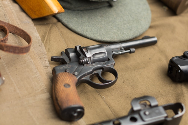 На импровизированных витринах были представлены гранаты образца 1924 года, которыми бойцы Красной Армии «встречали» немцев летом 1941 года, а затем «провожали» их до Берлина. Фляги и саперные лопатки колоритно смотрелись на фоне винтовки Мосина, пистолет-пулеметов Судаева и немецкого МP-40, а также пистолетов «Наган», «ТТ» (Тульский Токарев) и муляжей «Парабелума».