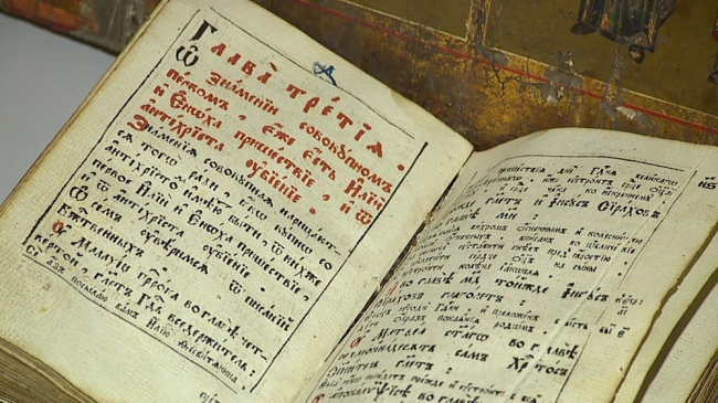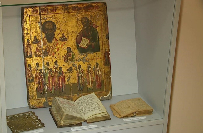 Среди экспонатов, особый трепет у ценителей древностей вызывает икона XVIII века, на которой изображены Николай Чудотворец с Иоанном Богословом. Кроме того, на выставке можно посмотреть книгу писателя XII века Никона Черногорца, отпечатанную триста лет назад в Петербурге.