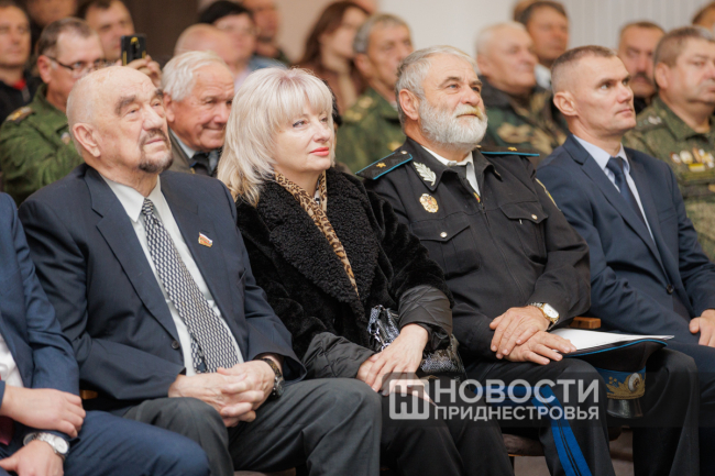 Звучала композиция о победной весне 1945 года – «На безымянной высоте». Её исполнил представитель бендерского округа ЧКВ Мадиан Мунтяну. В знак уважения к советским защитникам весь зал слушал песню стоя.