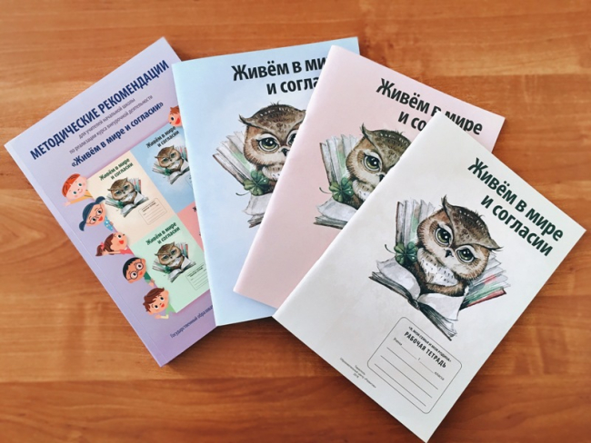 Госслужбе СМИ были предоставлены обязательные бесплатные экземпляры данных учебных изданий, одно из которых является методическим пособием для педагогов, и рабочие тетради «Живем в мире и согласии» для учеников 1-4 классов.