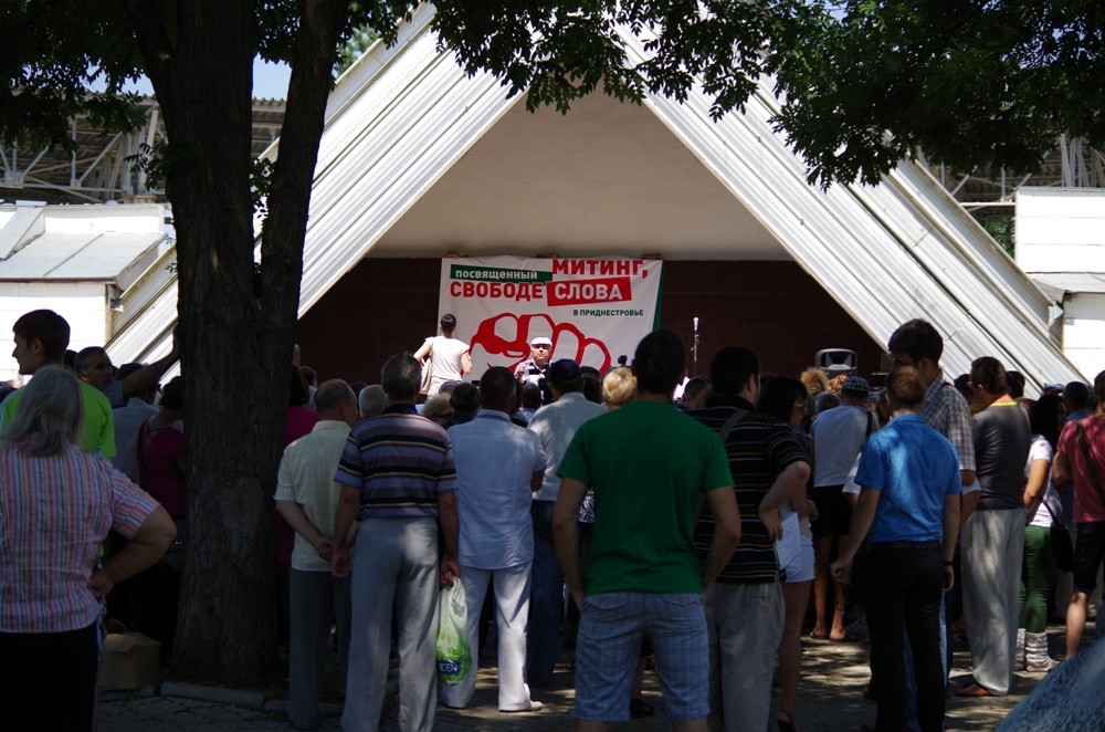 Неподалёку от того места, где выступал Оркестр Главного штаба Минобороны ПМР, сегодня митинговали. Несмотря на разрекламированность в сети Интернет этого мероприятия, участников митинга, посвящённого свободе слова, собралось всего около сотни человек, включая журналистов и любопытствующих случайных прохожих.