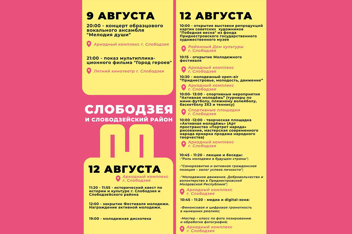 9 августа в 15:00 начнется форум для работающей молодежи «За нами будущее Приднестровья». Ожидается интересная программа с разнообразными площадками: творческими, спортивными, интеллектуальными. Также будет время для неформального общения и отдыха.
