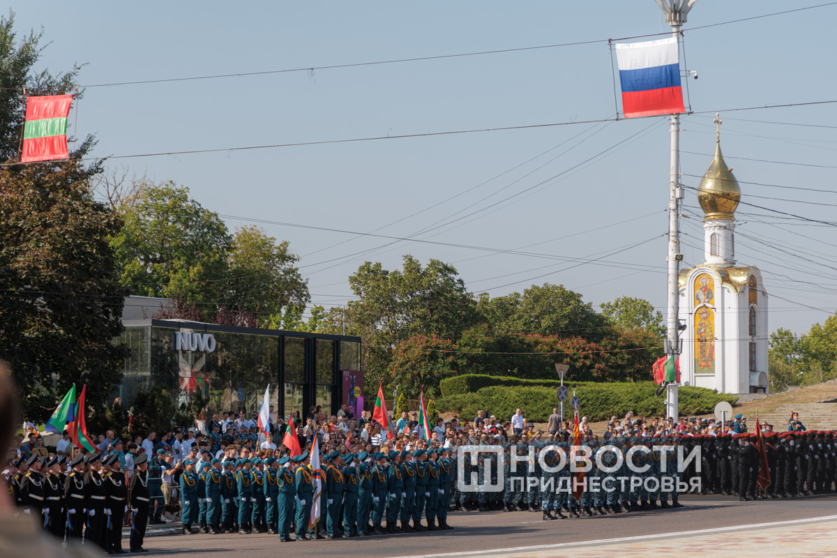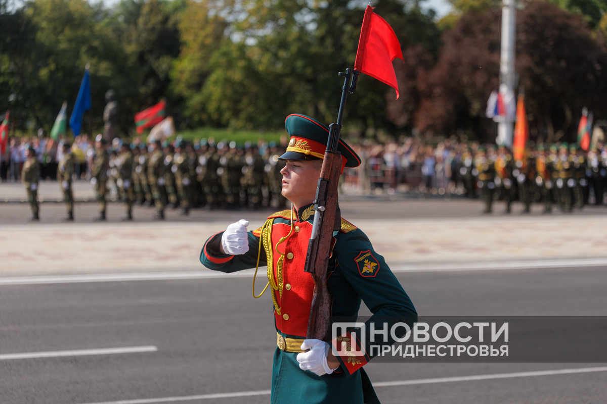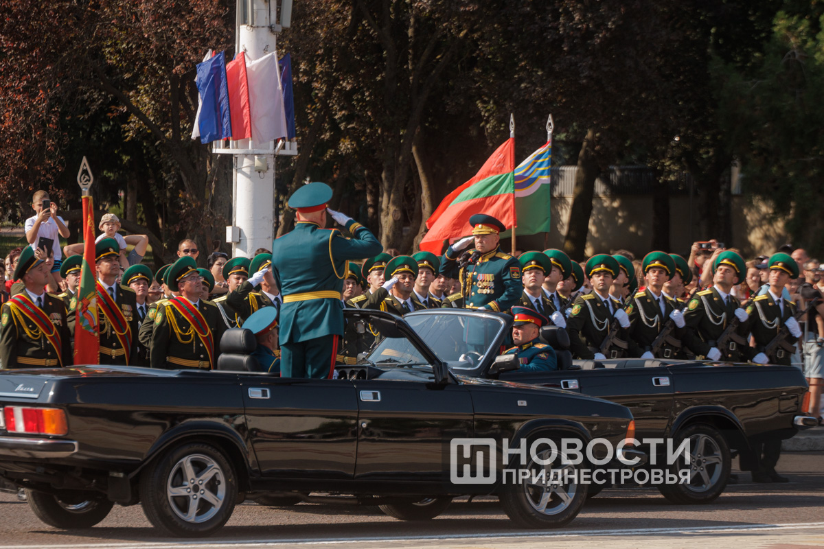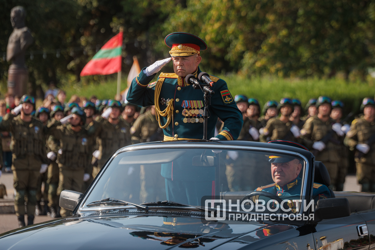 Военный парад принимает министр обороны Приднестровской Молдавской Республики генерал-лейтенант Олег Обручков. Командует парадом начальник Главного штаба Вооружённых сил генерал-майор Павел Михайлов. Глава оборонного ведомства традиционно совершил объезд парадных расчетов, поздравил участников с юбилеем республики и доложил Главнокомандующему о готовности к параду. Президент обратился к его участникам с приветственно-поздравительной речью.