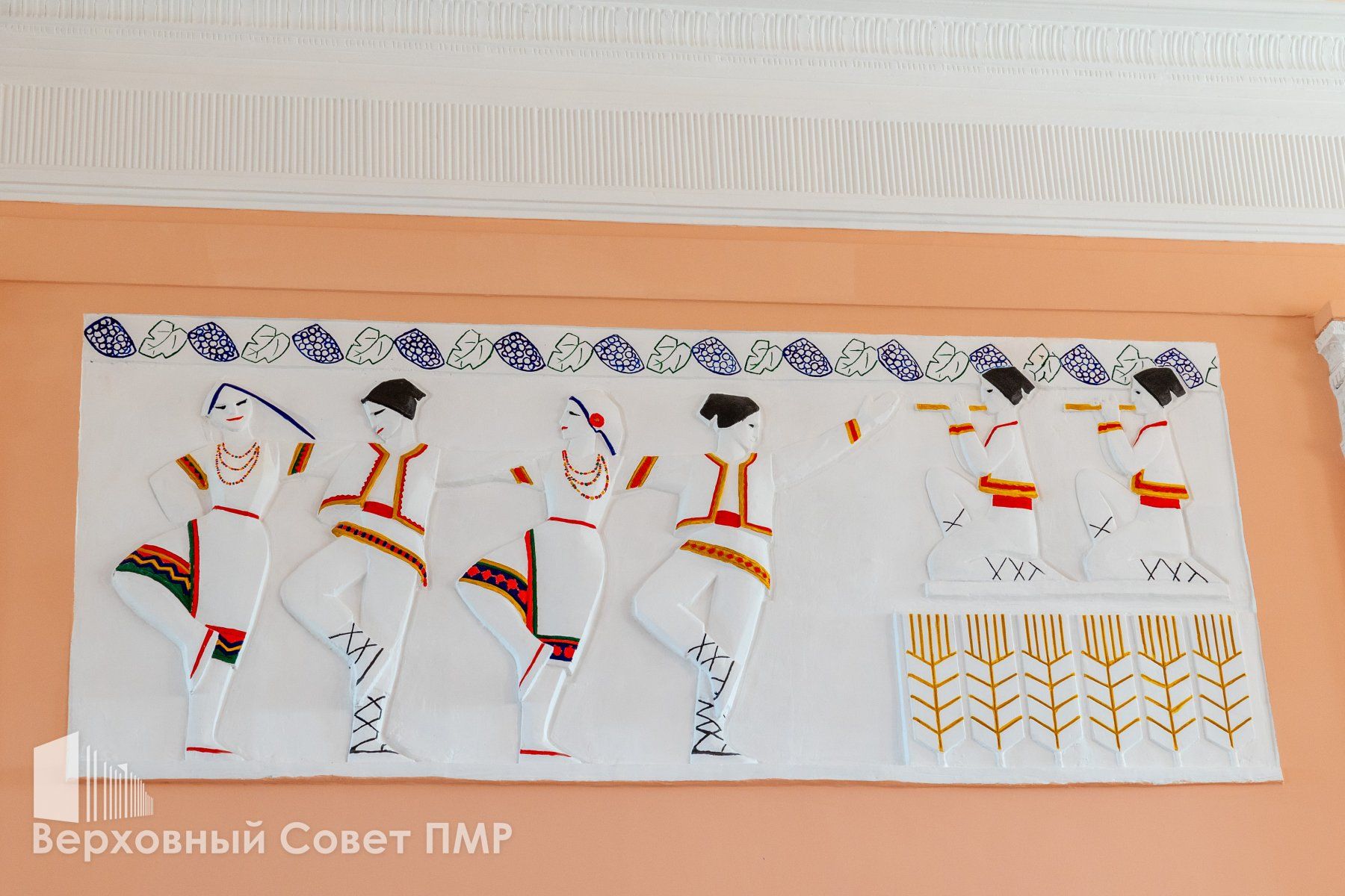Как сообщает парламентская пресс-служба, на данный момент в ДК обновили фойе, выровняли стены, сохранили и восстановили декоративную лепнину, оформили гипсовое панно с национальными мотивами, обновили покрытие пола.