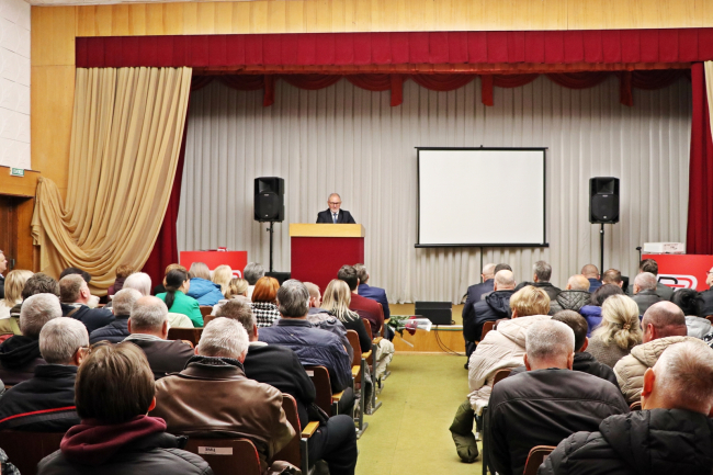 Поздравить коллектив прибыл замминистра экономического развития — начальник департамента энергетики и ЖКХ Евгений Гроссул. Он зачитал приветственный адрес главы Минэкономразвития Сергея Оболоника: