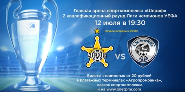 Тираспольский «Шериф» сразится в квалификации Лиги Чемпионов с албанским «Кукеси» Матч пройдёт на арене спорткомплекса 12 июля. Начало игры - в 20:00 12 Июл., 2017, 15:22 Спорт Приднестровье ООО "Шериф"