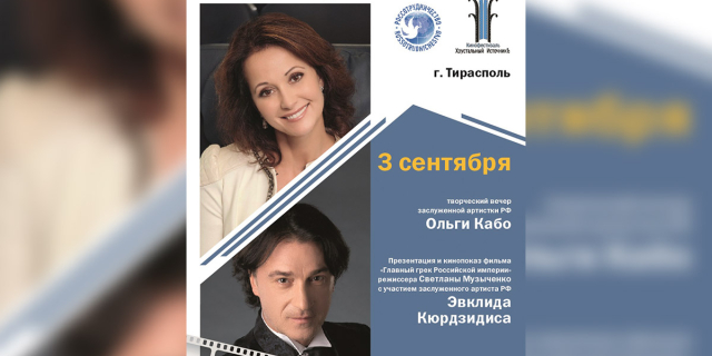 В Тирасполе пройдёт творческая встреча с российскими артистами 3 сентября в столичном кинотеатре выступят заслуженные артисты РФ Ольга Кабо и Эвклид Кюрдзидис, также покажут фильм «Главный грек Российской Империи» 01 Сен.., 2021, 14:42 Анонс кино Артисты