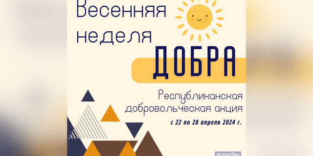 «Весенняя неделя добра» началась Акция продлится до 28 апреля 22 Апр., 2024, 10:05 Общество Минпрос Волонтёры