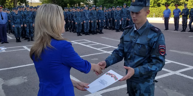 Курсантам ТЮИ МВД ПМР вручили благодарственные письма за участие в республиканских мероприятиях В рамках мероприятий в честь 9 Мая они участвовали в «Песенном флешмобе», параде Победы и танцевали на балу «Победный май» 24 Май, 2017, 16:49 Общество Тираспольский юридический институт МВД