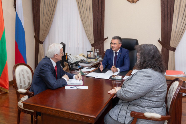 Tiraspol, 14 May. /Novosti Pridnestrovya/. The president held a meeting with the rector of Pridnestrovian State University (PSU) Stepan Beril and presidential state adviser Anna Volkova.