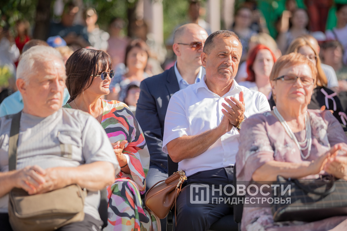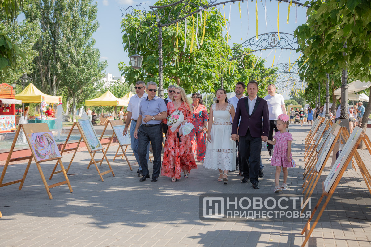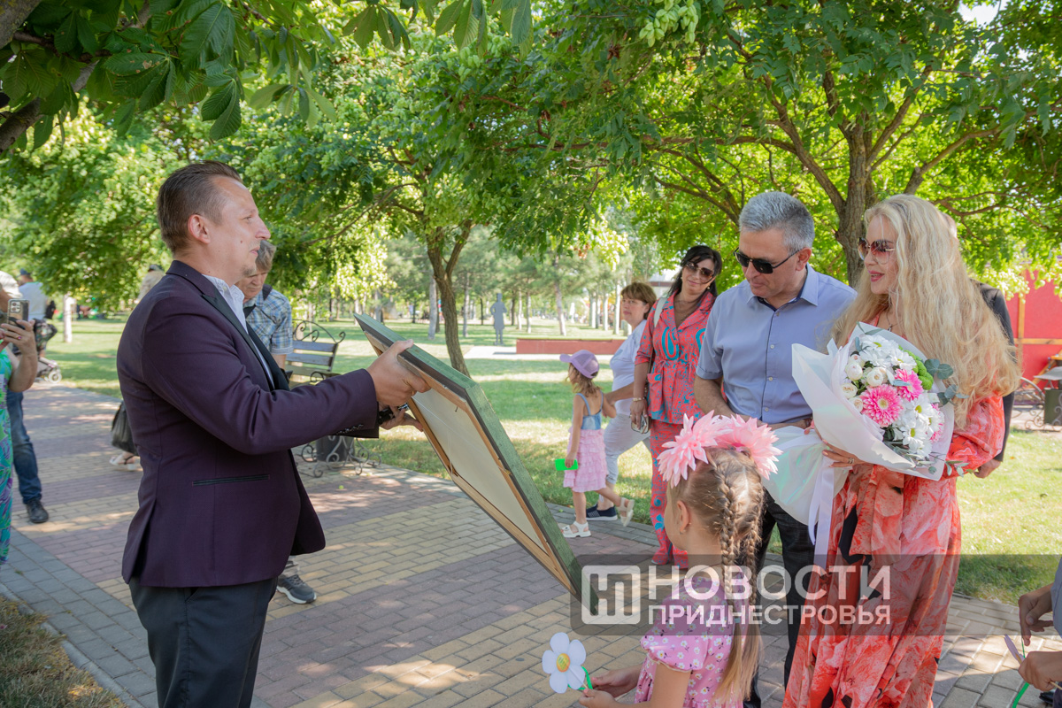 05 Jul., 2024, 20:38Pridnestrovians are preparing for the Day of Family, Love and Fidelity. A series of thematic events has started. The “Family is a magical symbol of life” family festival is taking place in the capital’s Catherine Park. Its program includes a ceremony honoring families with rich experience. This is a traditional event. The PMR President with his wife take part in it obligatory. The Krasnoselsky couple greeted the Korobkin family on the Alley of Fountains. The head of the family Denis Korobkin introduced to the guests of honor his wife – the namesake of the wife of the PMR President – Svetlana and their children – Maxim and Nika. The couples went to an exhibition of creativity of Pridnestrovian masters. Svetlana Krasnoselskaya wrote on one of the canvases that a family begins with a happy childhood, where there are grandparents, mother and father.