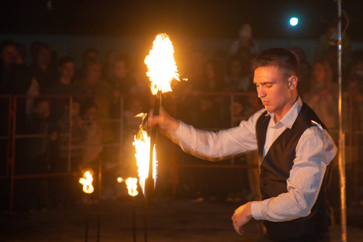 The fire show became the effective ending of the festival. 20 minutes of a show unambiguously subdued the audience: everyone stood enchanted and watched work of fakirs. Together with fire pyrotechnics was also used, so it became an improbable fascinating beauty.
