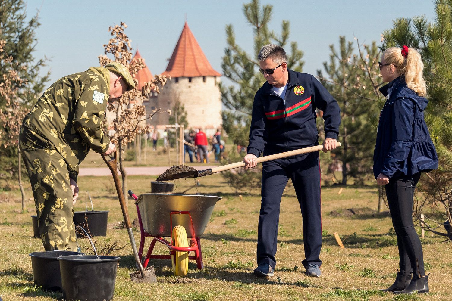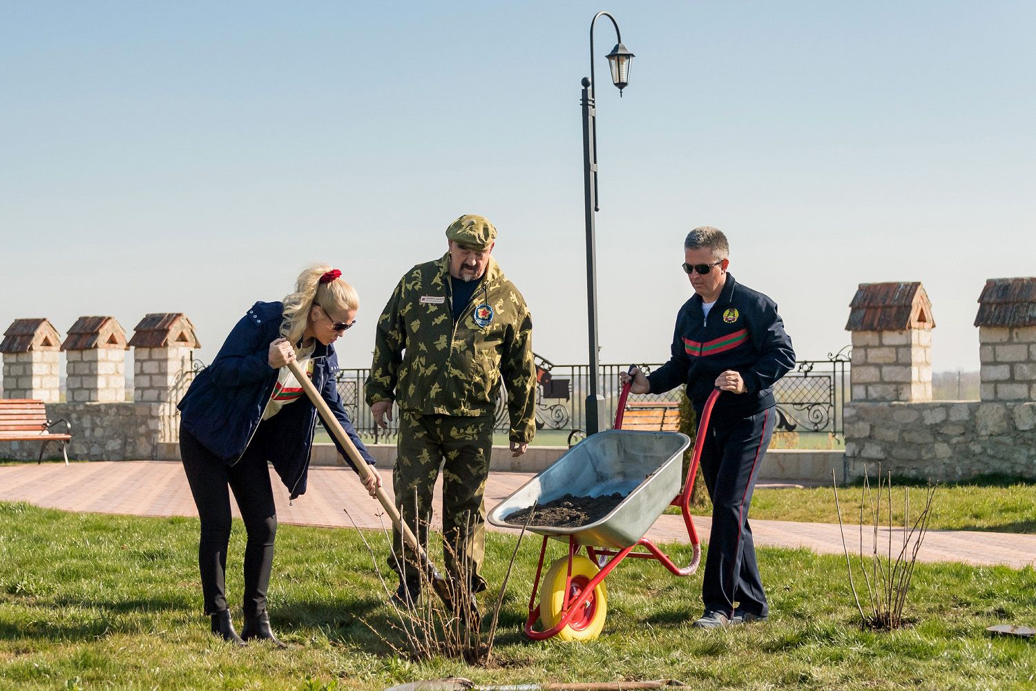 Participants were welcomed by the Head of the state who arrived with the spouse Svetlana Krasnoselskaya. The President reminded that last year also within the all-republican Saturday voluntary work day trees and bushes were planted here.