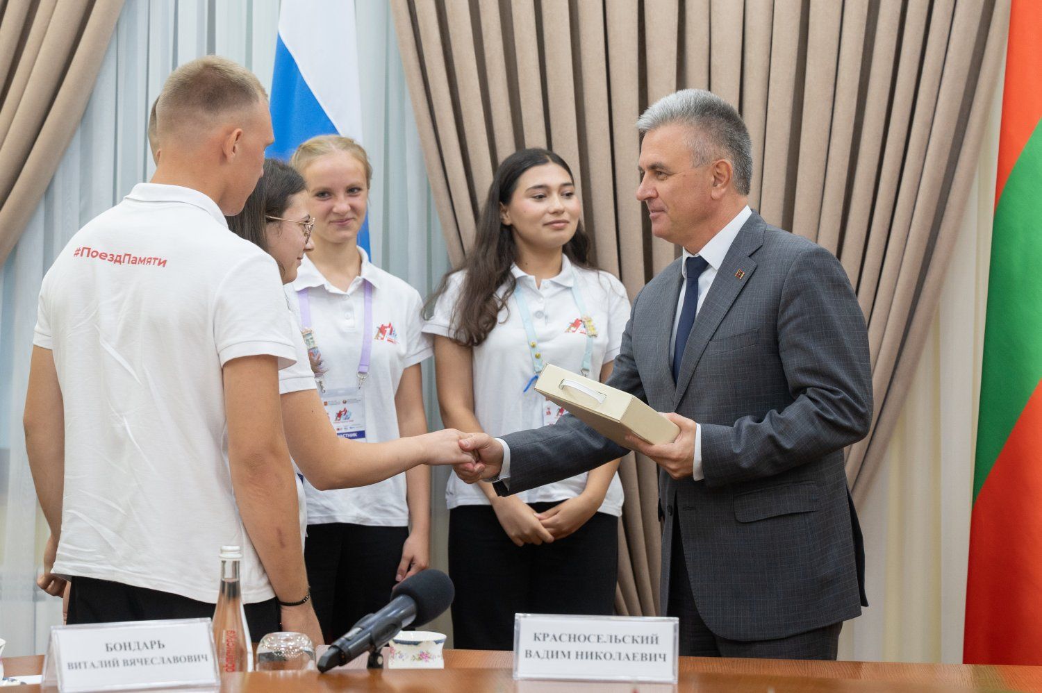 Suvorov military college pupil Alexander Yatskov, student of Bendery school No. 15 Margarita Makarova, resident of Rybnitsa Anastasia Tkachuk, high school student from Dubossary Alexandra Pokasovskaya and lyceum student Nestor Ciobanu from Grigoriopol shared their impressions of participating in the "Train of Memory" project with the President. They said that the event was held for the fourth time, but Pridnestrovie was represented for the first time. If only Russian and Belarusian children participated in the first year, then the project united this year two hundred schoolchildren from one and a half dozen countries. They visited 15 cities in Russia and Belarus during the two-week journey. They covered 8730 kilometers. 3203 video greetings were transmitted from various historical and memorable places associated with the Great Patriotic War. There were unexpected meetings. A professional freestyle wrestler Nestor Ciobanu said that he personally met the legend of Soviet and Russian sports, four-time Olympic medalist, and senator of the Federation Council of the Federal Assembly of the Russian Federation Alexander Karelin, received instructions and a memorable gift from him. The passengers of the "Train of Memory" were lucky enough to attend the St. Petersburg graduation ball "Scarlet Sails".