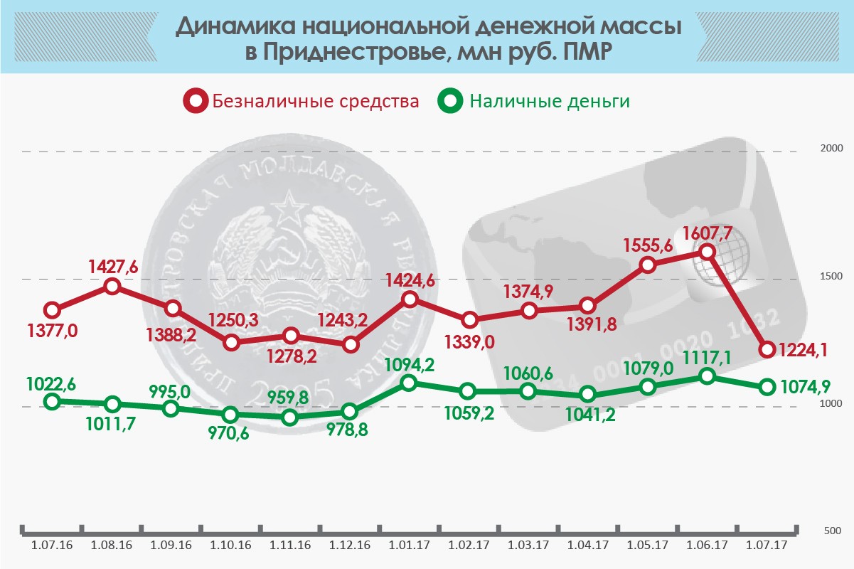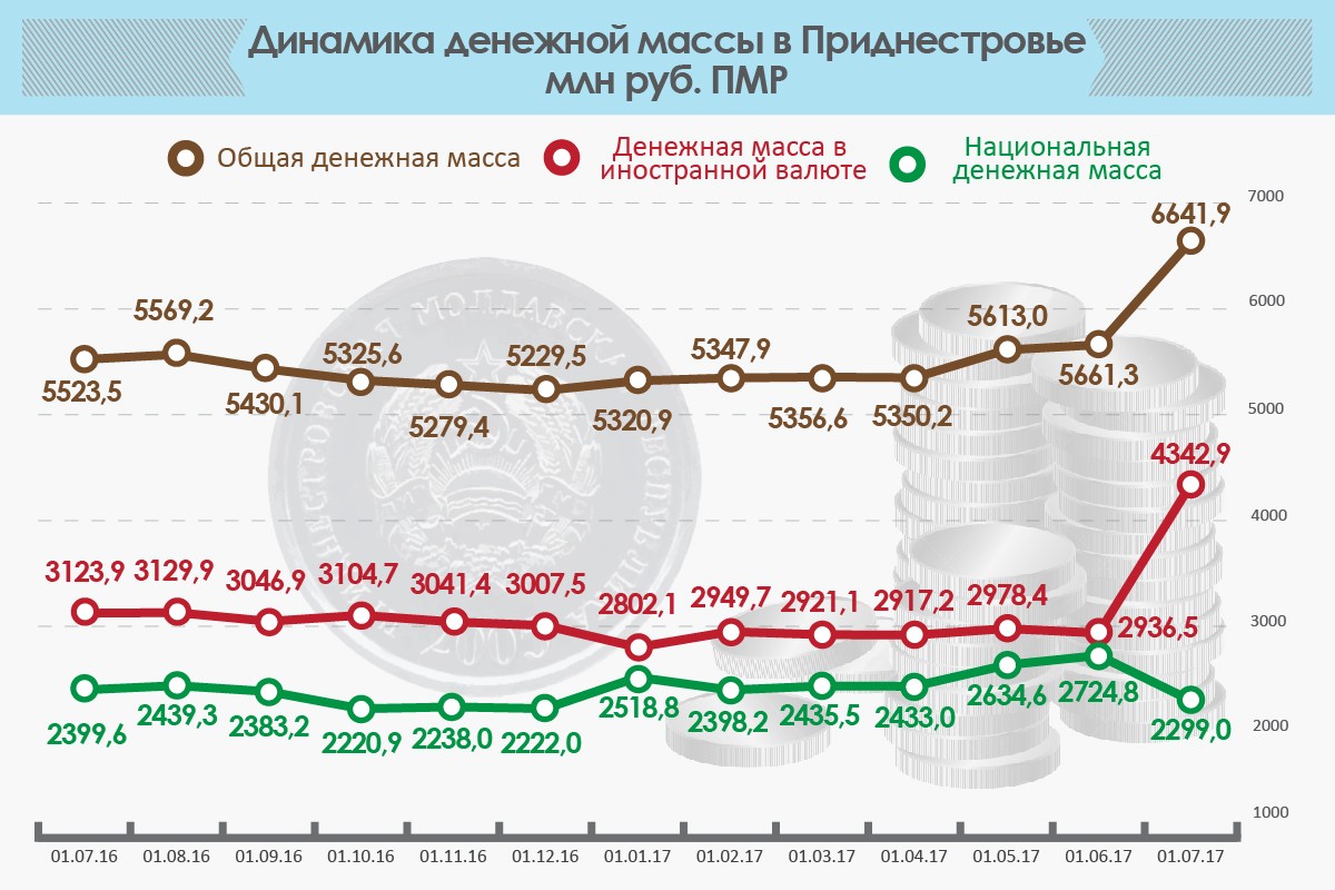 Tiraspol, 4 July. /Novosti Pridnestrovya/. According to the monetary statistics, the total volume of money supply increased by 17.3% in June 2017. As of 1 July, this figure was 6,64.9 million roubles, the Pridnestrovian Republican Bank reports.