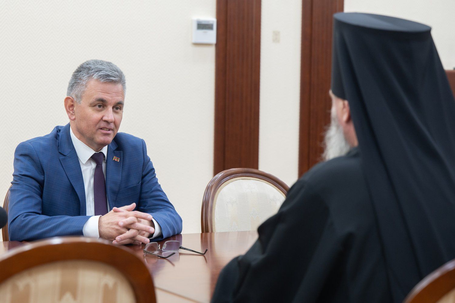 The interlocutors mentioned the fact that the Resurrection of the Lord is celebrated simultaneously by the entire Christian world this year. Archbishop Sawa told how Bright Week is going. He held the Easter service on the night of April 20 in the capital's Church of the Exaltation of the Cross. A live television broadcast was conducted for the flock, who celebrated the bright holiday at home. The Easter vesper service were celebrated by the Archbishop in the Cathedral of the Nativity of Christ in Tiraspol. He also celebrated the liturgy there on the second day of Easter. On Tuesday, the Archbishop held a service in the Transfiguration Cathedral in Bendery, and today in the All Saints Cathedral in Dubossary. The Archbishop said that after the Divine Liturgy, he visited the Bouquet of Moldova vineyards and consecrated a chapel built there in honor of the holy martyr Tryphon, the patron saint of farmers and winegrowers. Afterwards, the Archbishop visited Grigoriopol, where he bowed to the icon of the Mother of God of the Three Hands installed in the chapel. The Archbishop also mentioned the services held during Easter in various social institutions. For example, the priest of the Republican cadet corps held a festive service for the pupils and employees of the Makarenko Republican Educational and Training Complex today. Festive liturgies are also held in penitentiary institutions. It is traditional to hold a so-called parental day in places of imprisonment during Easter, when those serving sentences have the opportunity to meet with their loved ones and participate together in services held in house churches at penitentiary institutions. Vadim Krasnoselsky emphasized the special significance of such events and thanked the Archbishop and all the clergy for their work in the name of preserving Orthodox and universal values.