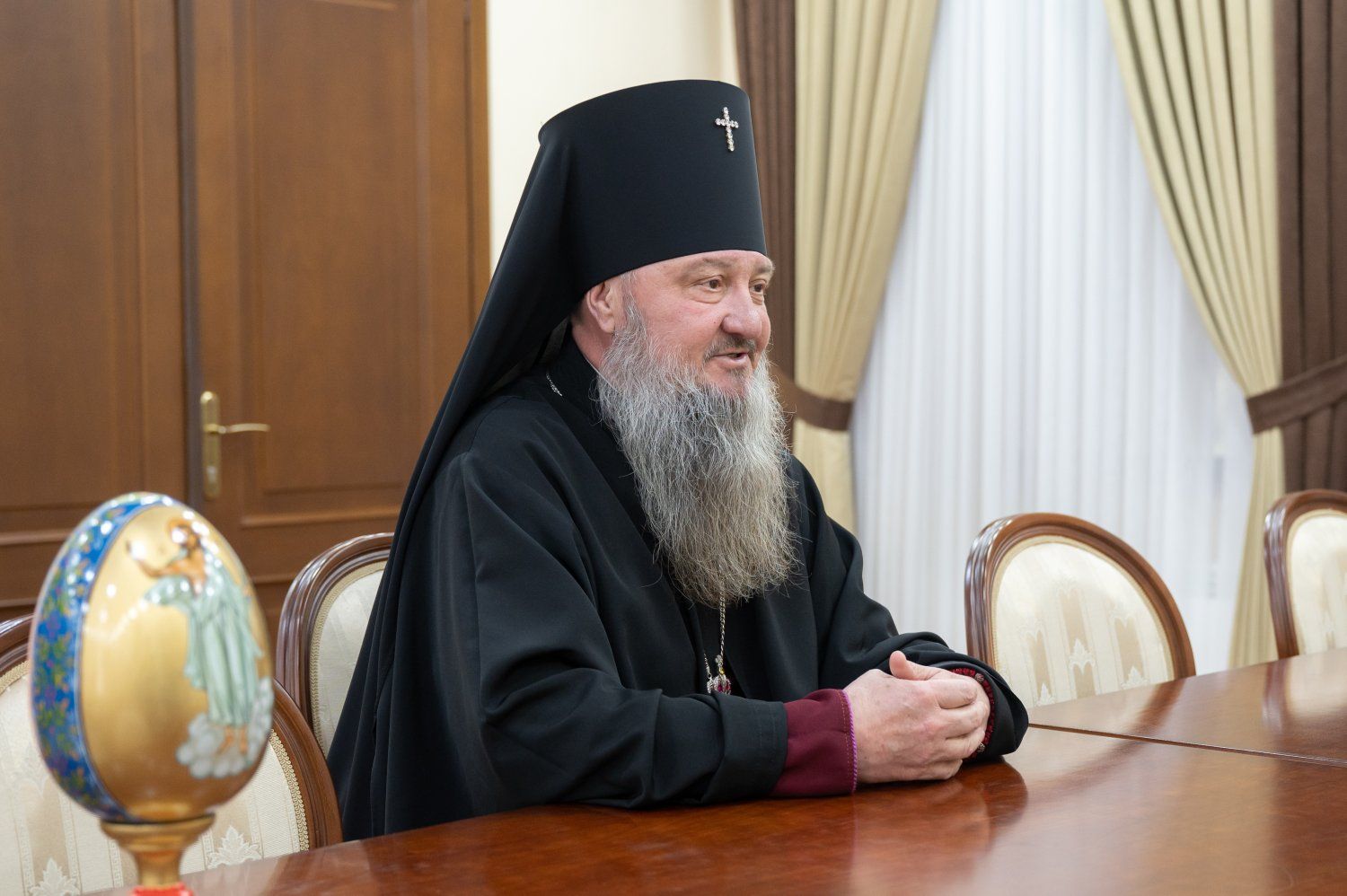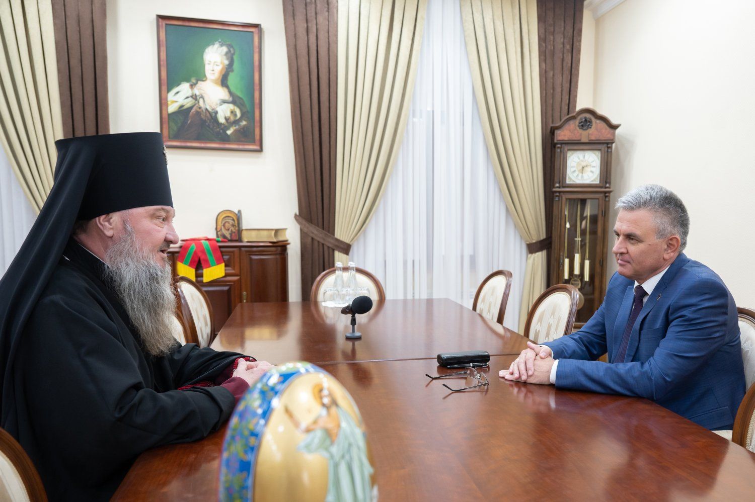 23 Apr., 2025, 16:04Meeting of Vadim Krasnoselsky and Archbishop of Tiraspol and Dubossary Sawa took place at the presidential executive office. The working conversation was preceded by an exchange of Easter greetings. The churchman presented the head of the country with a hand-painted Easter egg, which depicts a copy of the icon of the Resurrection of Christ, located in the Tiraspol Church of the Exaltation of the Cross.