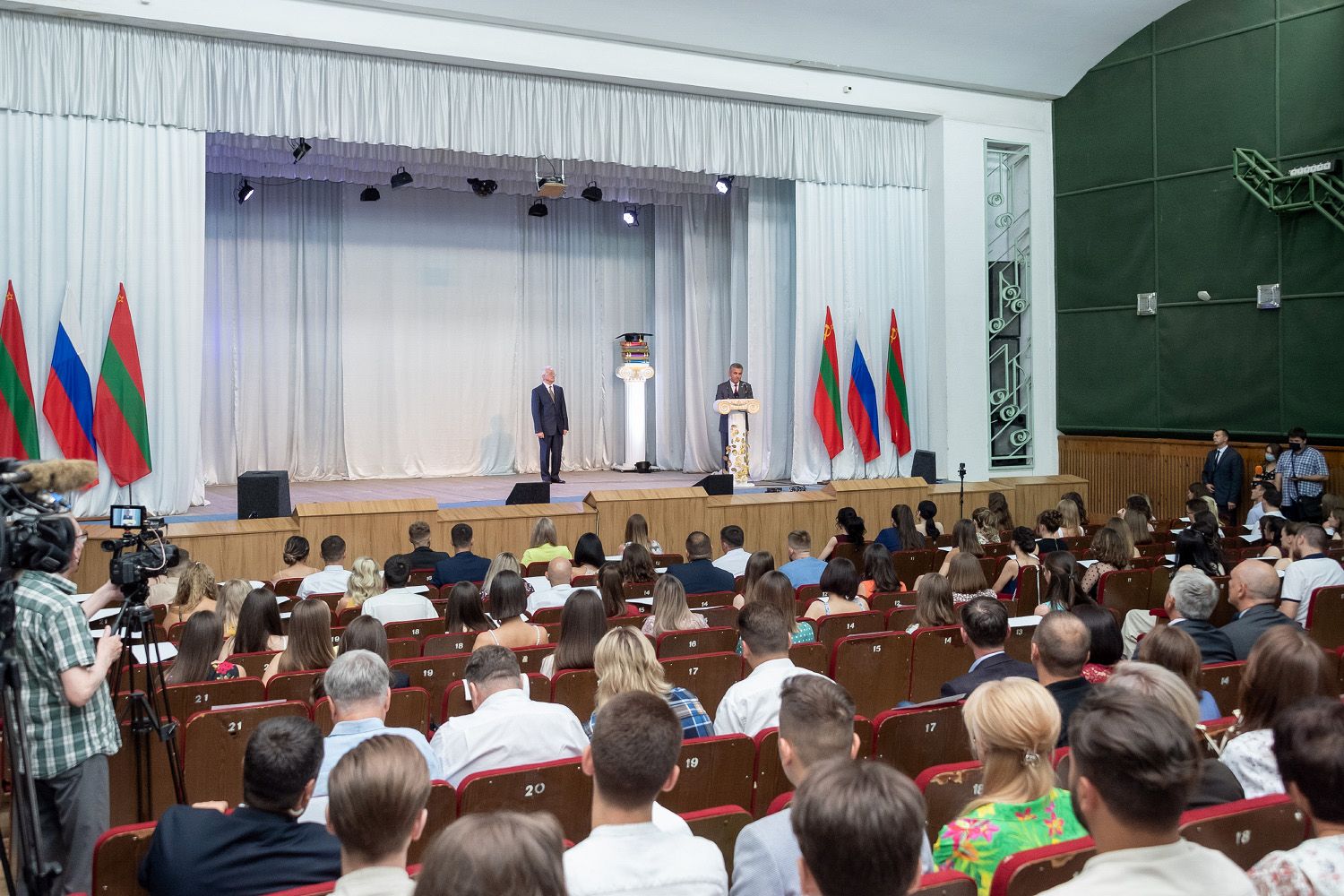 Pridnestrovian State University named after T.G. Shevchenko with more than 90 years of history that meets modern scientific and educational standards. It consists of eight faculties, two institutes and the same number of branches. The staff of the Pridnestrovian State University is about two thousand people. More than half of the employees are directly involved in scientific and educational activities. A third of the teaching staff are candidates and doctors of sciences. The learning process is organized in three languages. The student community unites about ten thousand people. They study in 230 undergraduate and graduate courses. 1786 graduates finished in 2021. Almost a thousand have completed full-time training, 790 - graduates of the correspondence department. As a result of the training, 372 now former students of the Pridnestrovian State University earned honors. The documents on graduation from the university were in the hands of everyone, except for the graduates of the medical faculty of the Pridnestrovian State University by today. They complete the series of celebrations. The PMR President with his family arrived at the final university graduation of this year. The celebration took place at the site of the Cultural and Educational Center of the Pridnestrovian State University.