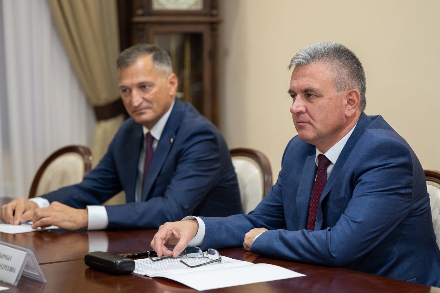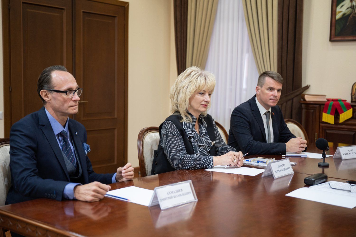 14 Nov., 2023, 12:06The PMR President Vadim Krasnoselsky received the leadership of the Pridnestrovian State Theater named after Nadezhda Aronetskaya – director Denis Apter and chief director Dmitry Akhmadiev. The meeting was attended by Advisor to the PMR President Pavel Prokudin and Head of the State Service for Culture and Historical Heritage of the Pridnestrovian Moldavian Republic Maria Kyrmyz.